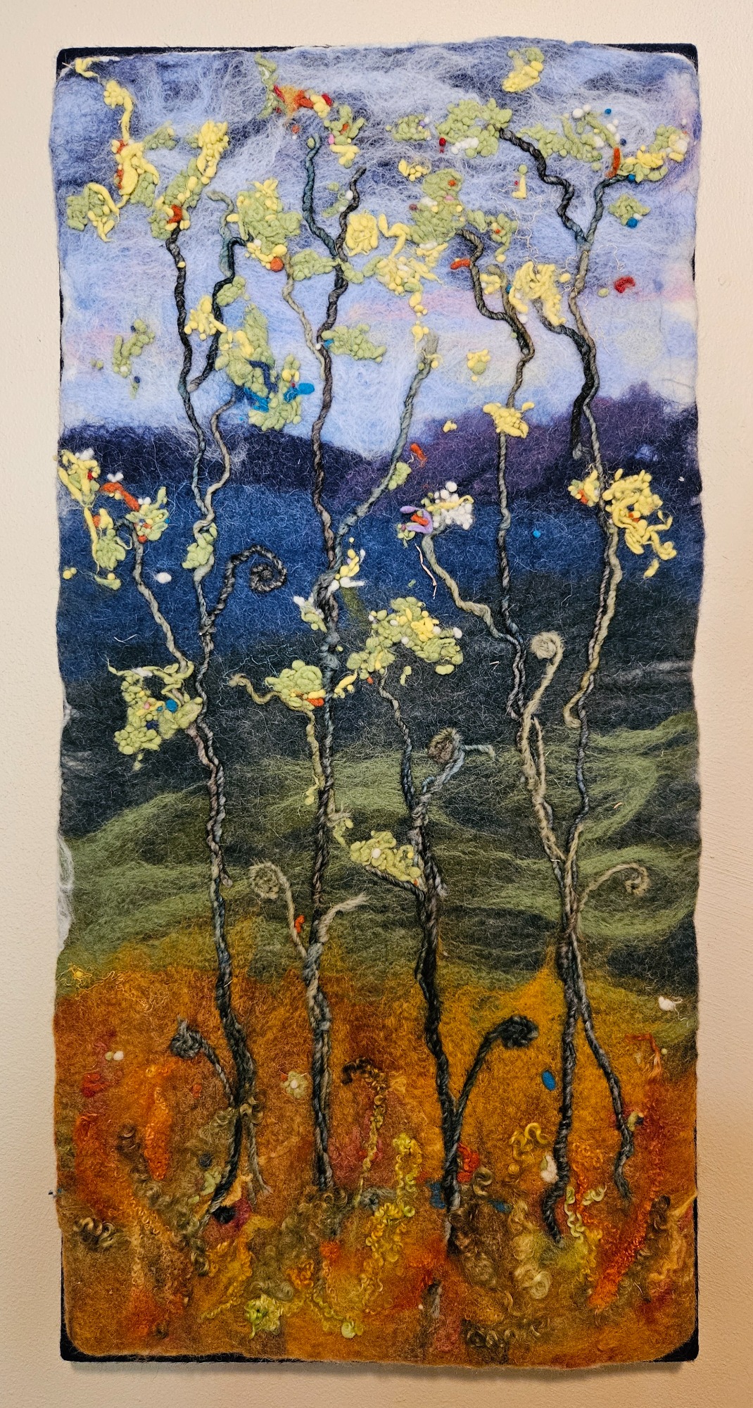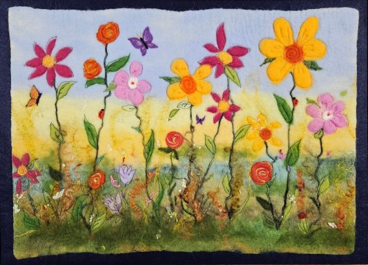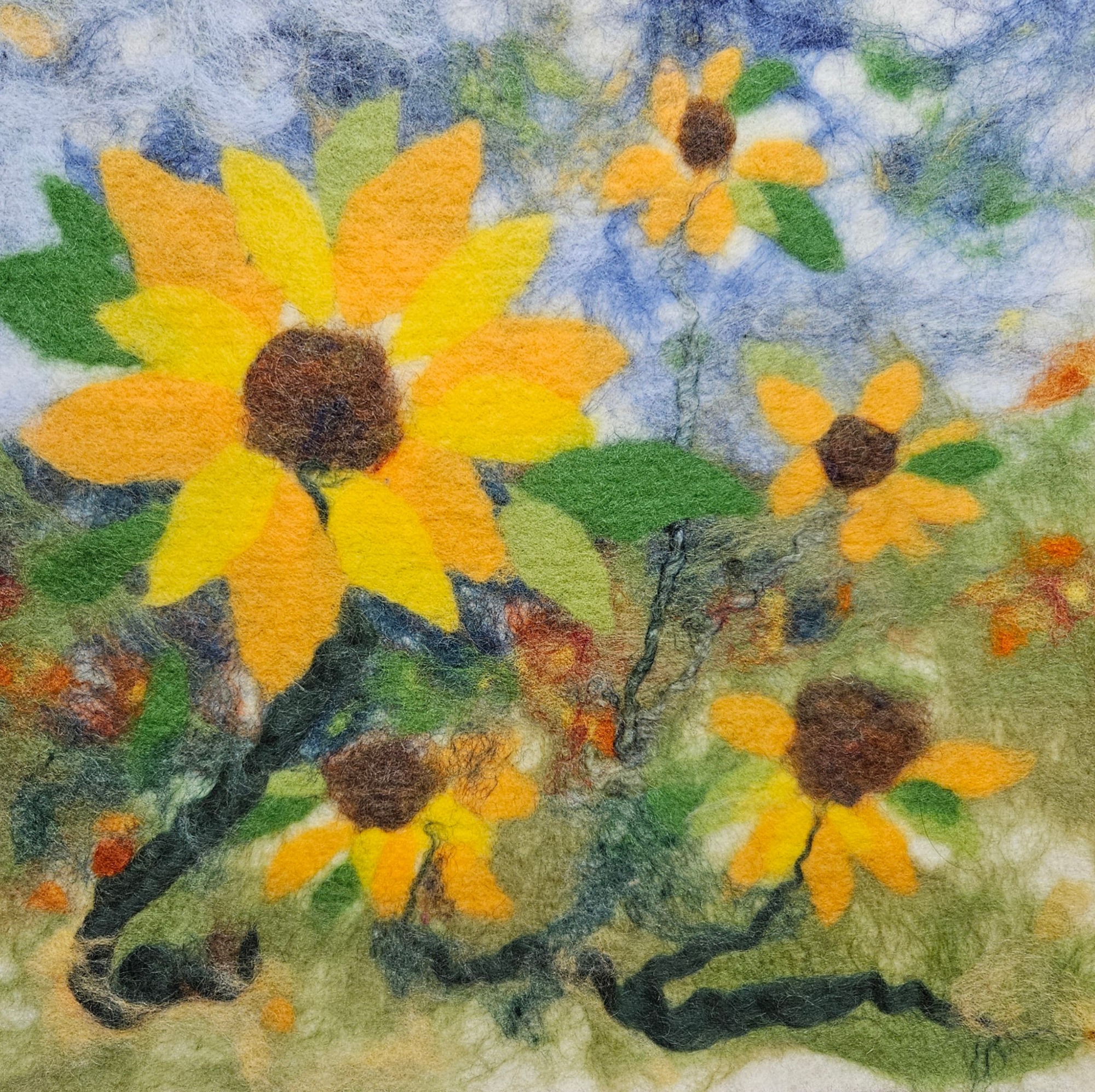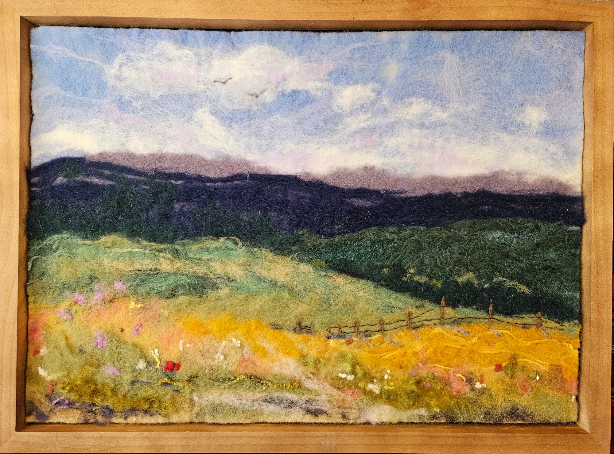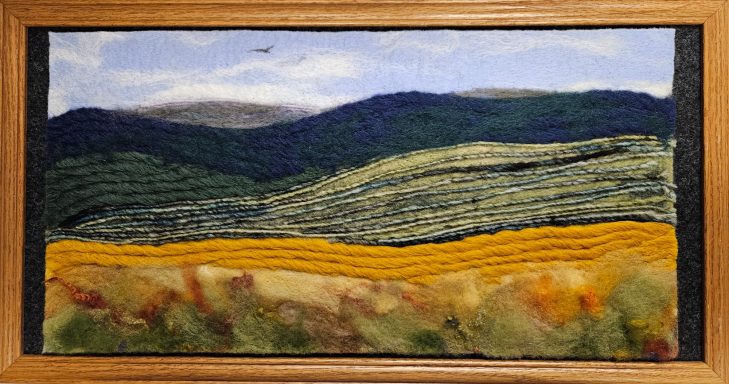 My wool paintings are created using both a wet felting and needle felting process. Some paintings are a single technique and others use both.